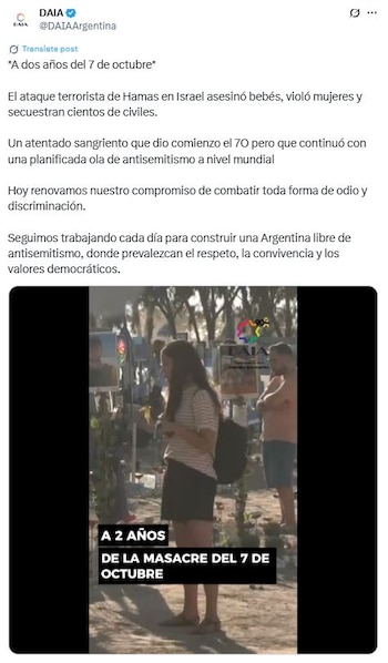 “A dos años del 7 de octubre*. El ataque terrorista de Hamas en Israel asesinó bebés, violó mujeres y secuestraron cientos de civiles”, empezó diciendo la organización que representa a las instituciones judías argentinas. La publicación prosiguió: “Un atentado sangriento que dio comienzo el 7O (7 de octubre) pero que continuó con una planificada ola de antisemitismo a nivel mundial”, insistieron las autoridades.