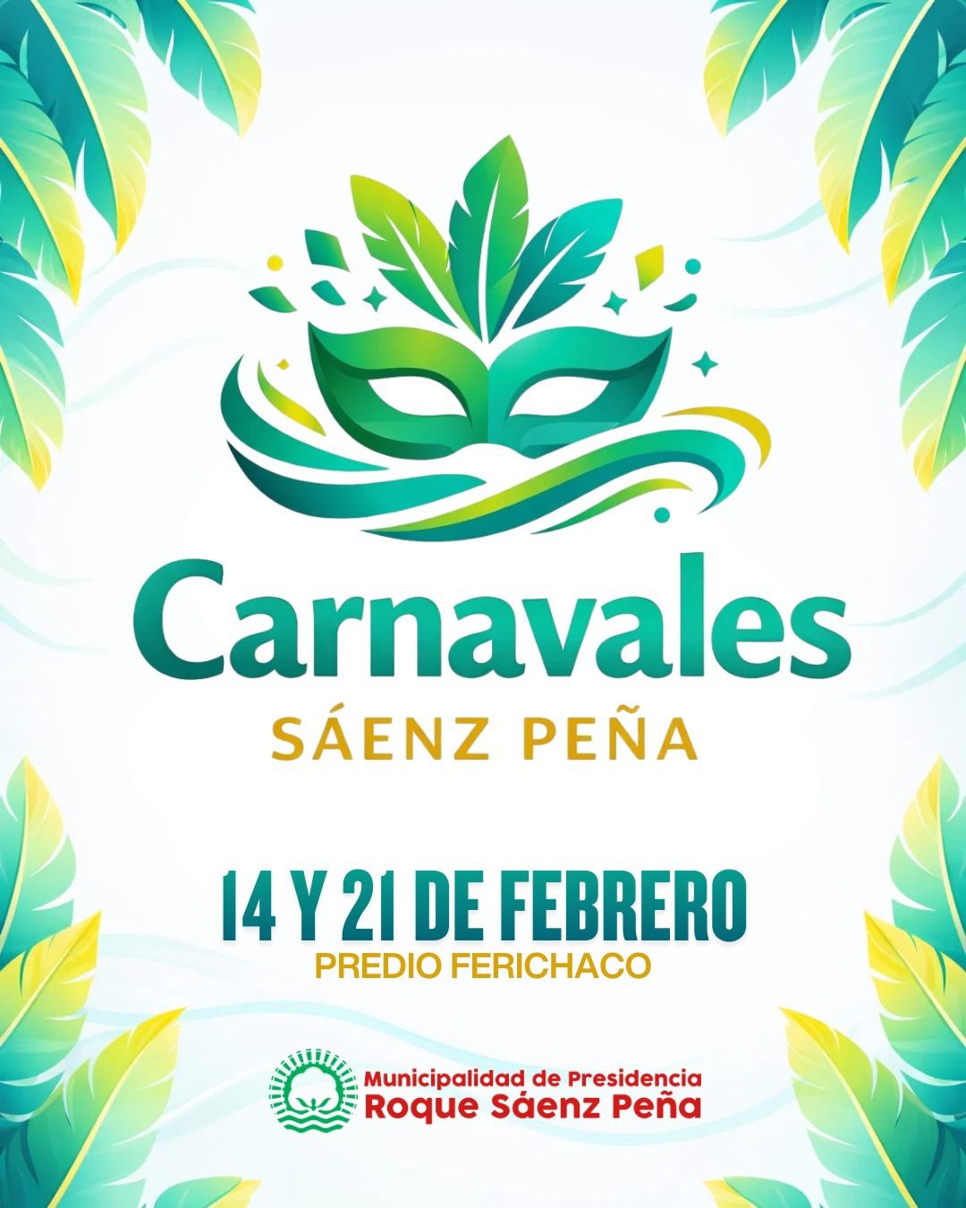 La Municipalidad de Presidencia Roque Sáenz Peña invita a toda la comunidad a disfrutar de una nueva edición de los Carnavales Saenzpeñenses, que se llevarán a cabo los días 14 y 21 de febrero en el Predio Ferichaco, con el brillo, la música y la alegría de las comparsas locales.