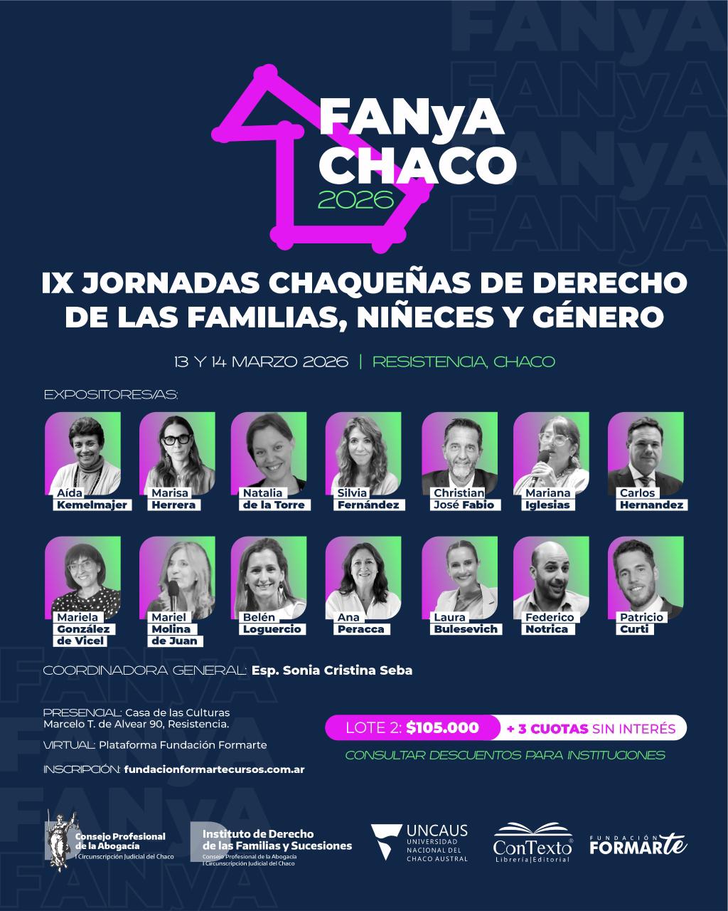 Las IX Jornadas son organizadas por el Instituto de Derecho de Familias y Sucesiones, el Consejo de Abogados y Procuradores de la I Circunscripción Judicial del Chaco, la Universidad Nacional del Chaco Austral, Fundación Formarte y la Librería Editorial ConTexto.