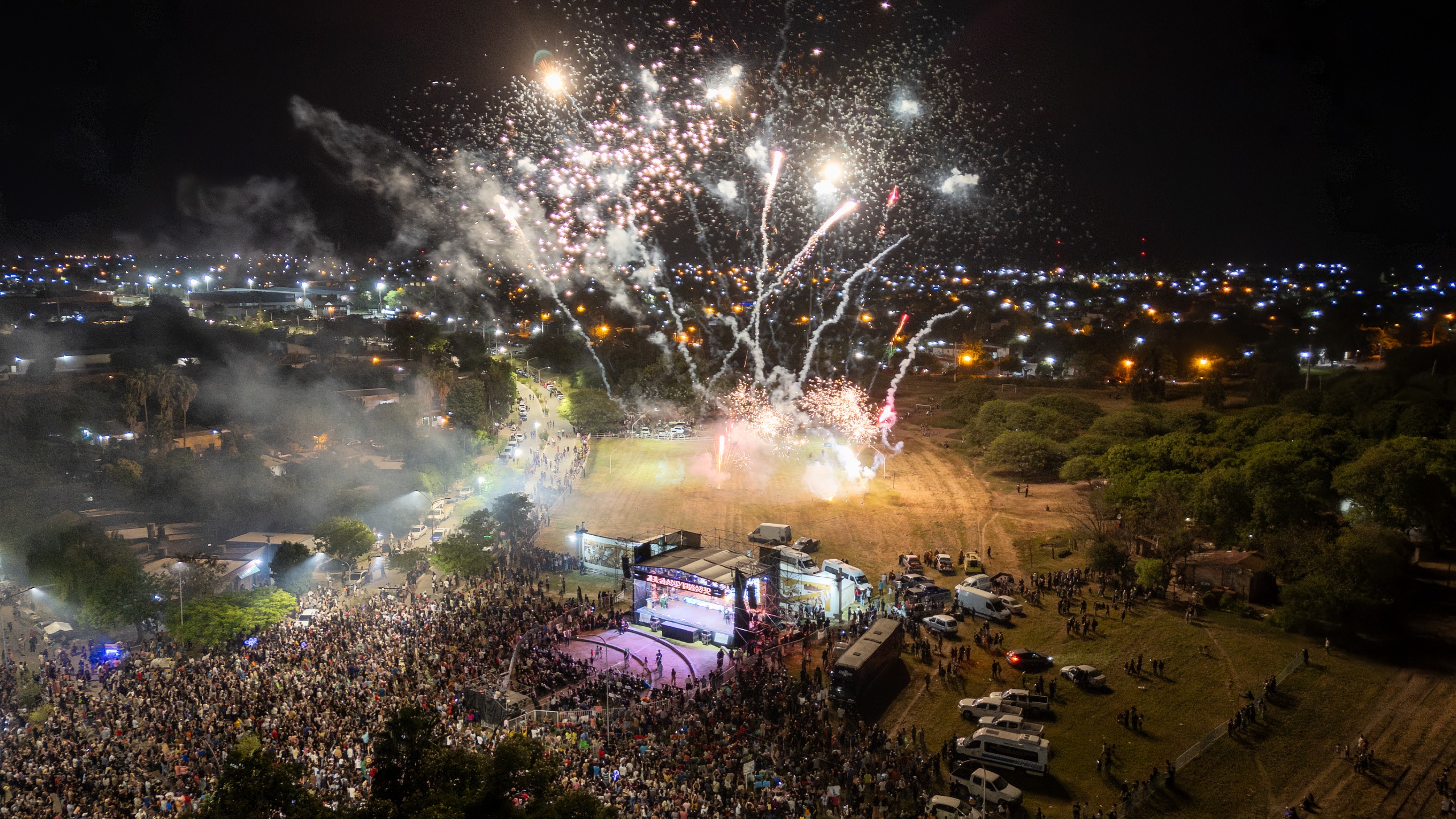 A la medianoche, la Banda Municipal de Música «Fortunato Felcher» interpretó el tradicional “Feliz Cumpleaños”, marcando el momento más emotivo de la velada, mientras el cielo se iluminaba con fuegos artificiales.
